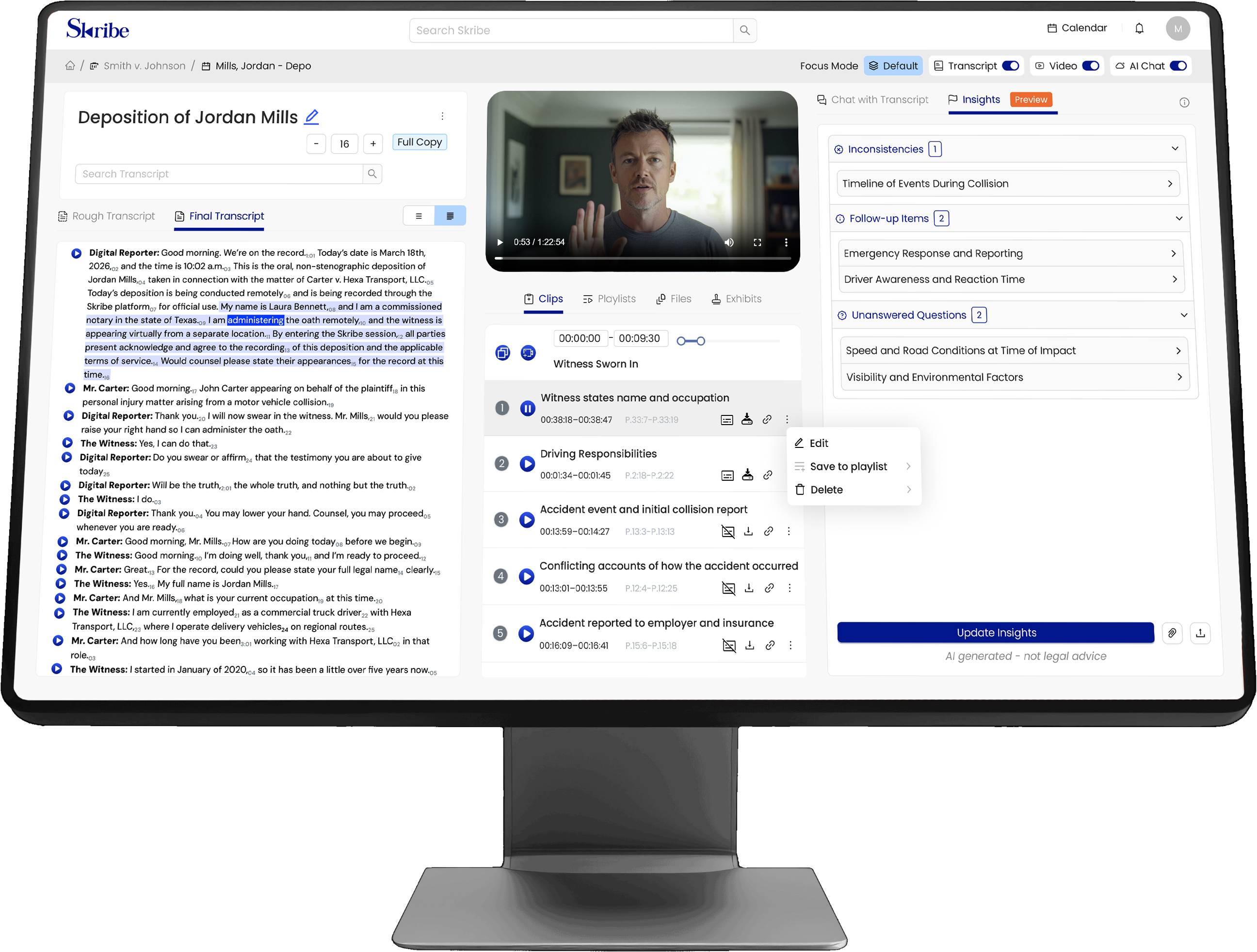 Skribe is a digital reporting and Deposition Intelligence Platform built for modern litigation. We capture legal testimony using secure video and audio, provide fast ASR-powered access to searchable transcripts, and deliver human-verified final transcripts you can rely on. Inside the platform, testimony becomes an asset you can search, analyze, summarize, and reuse across your case. Skribe is designed to help litigators move faster, spend less, and work with testimony more effectively without sacrificing accuracy or accountability.
