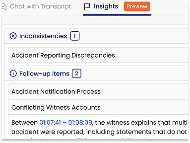 AI Insights reviews your transcript and highlights moments that may deserve another look. It surfaces inconsistencies, follow-up opportunities, and unanswered questions while the deposition is still happening or shortly after.